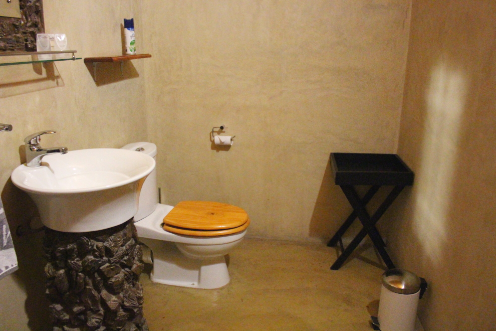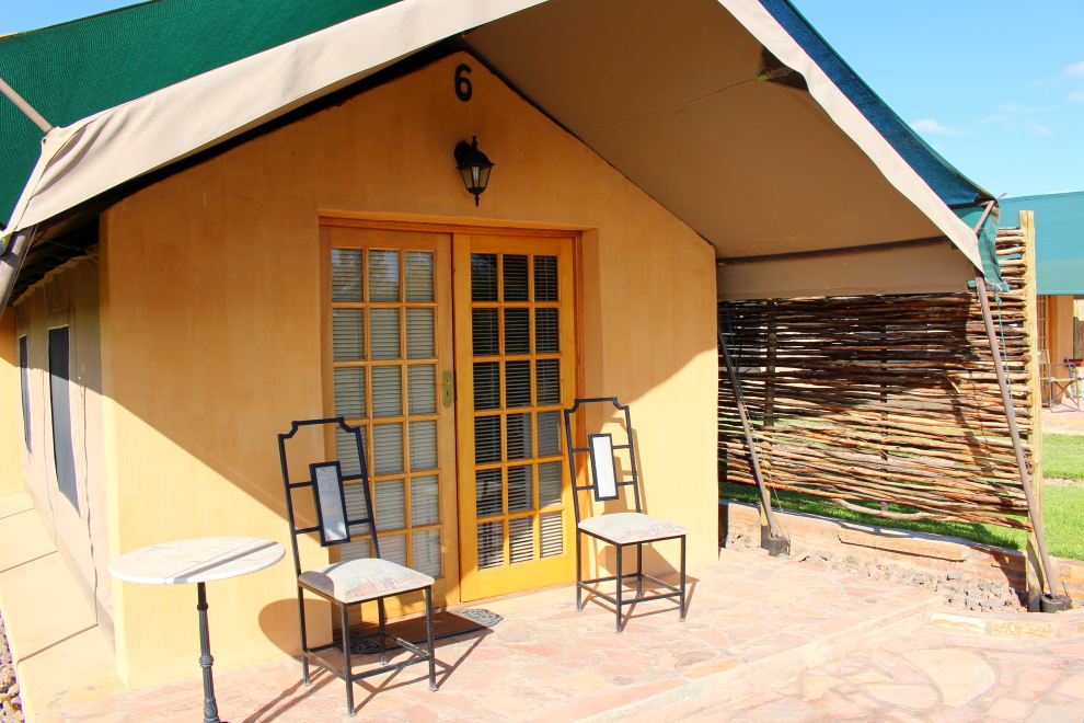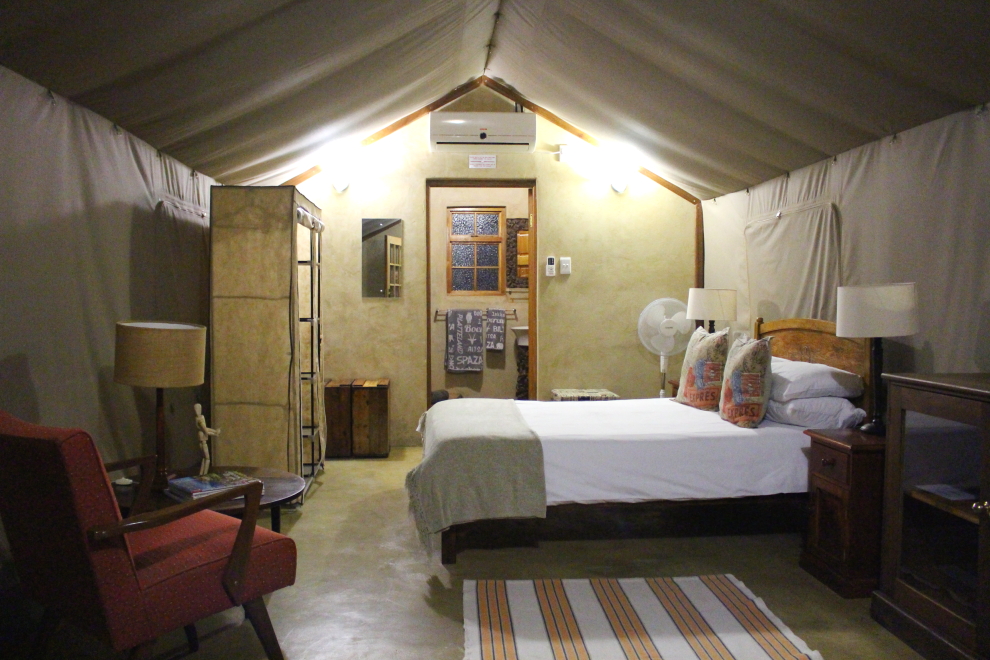 Teraz ale späť k nášmu ubytovaniu – eco chatky s terasou/ moderné safari stany boli 2 lôžkové a 3 lôžkové – vybavené vlastnou kúpeľňou, klimatizáciou a barovou chladničkou. Predná a zadná stena bola vyhotovená zo slamených balíkov, obvodovú konštrukciu tvoril pevný stan, podlaha bola vyrovnaná a spojená napevno so zemou. Strecha mala dve vrstvy, medzi ktorými bola vzduchová medzera, aby trochu zabránila veľkým horúčavám vo vnútri.