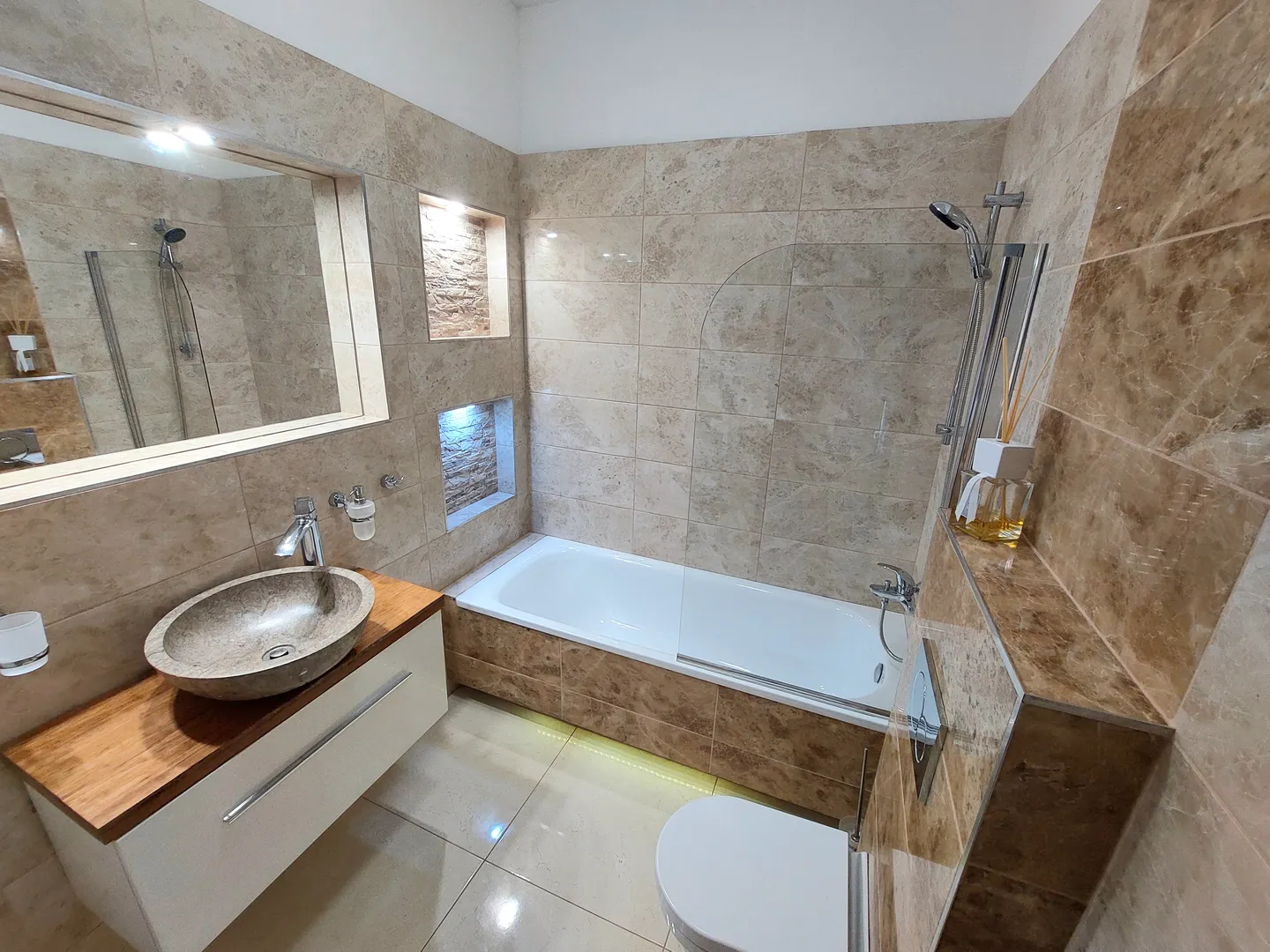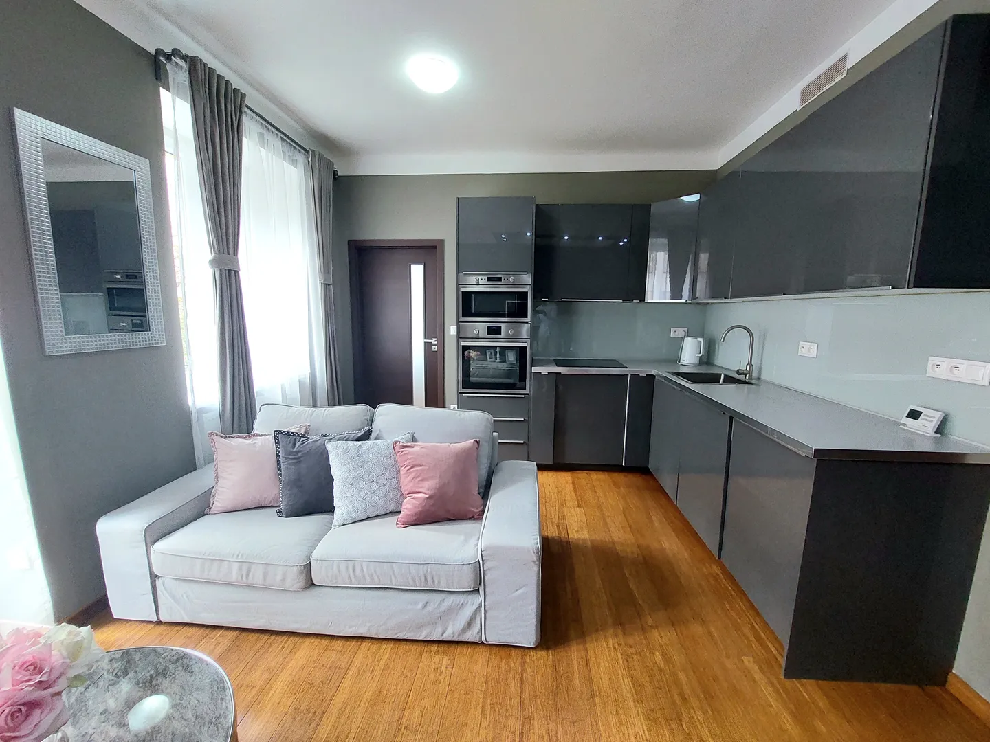 – kuchynská linka na mieru (vstavaná umývačka riadu, indukčná varná doska, elektrická rúra, digestor, chladnička, zabudovaná práčka)