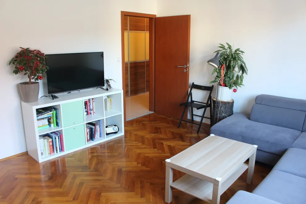 Dispozícia bytu tvorí: predsieň (8,5 m2), prechodná kúpeľňa (6 m2), kuchyňa (10 m2), komora (1 m2), izba (19,5 m2), izba (20 m2), samostatné wc (1 m2). Pivnica sa nachádza na prízemí s rozlohou 5,5 m2. Balkóny sú v byte dva, jeden z kuchyne a druhý z izby. Náklady na byt- zálohový predpis 184 eur na 2 dospelé osoby a 1 dieťa. Plyn v byte nie je, elektrina je cca. 15 eur/ mesiac.