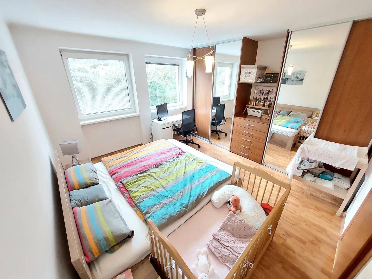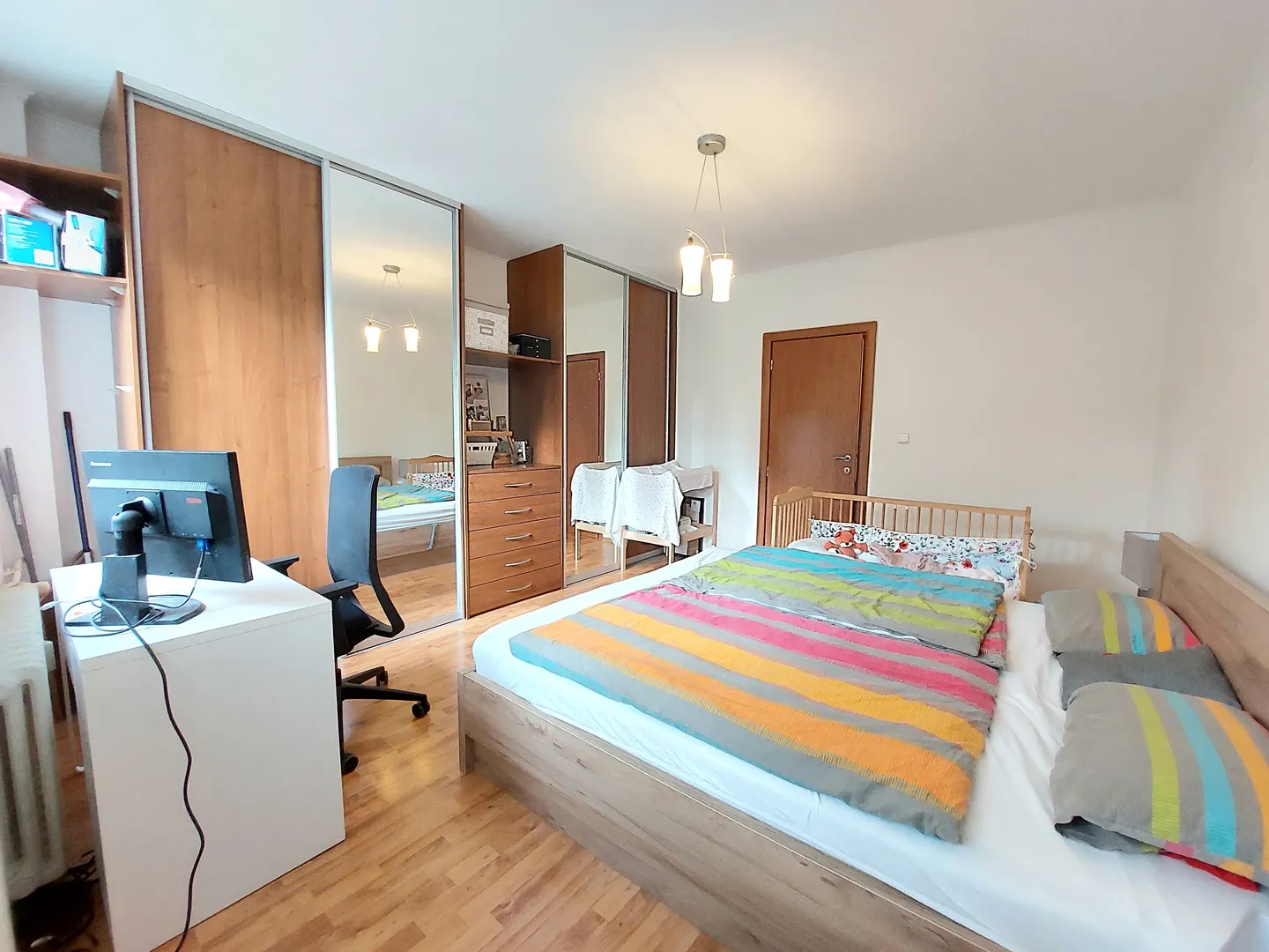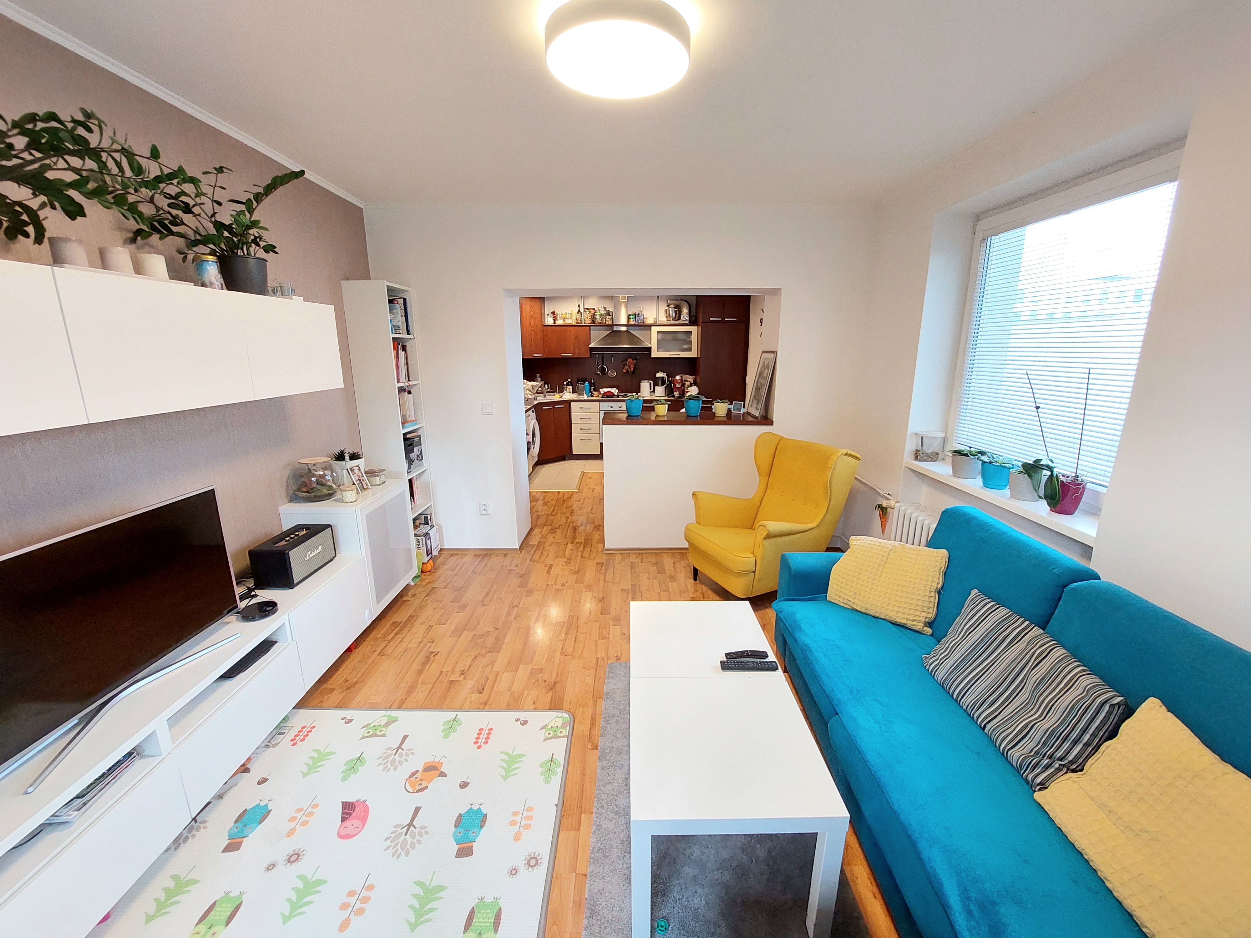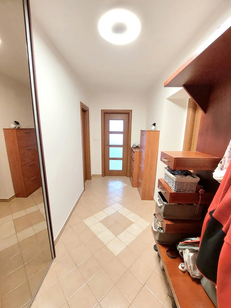 Byt je veľmi dobre dispozične riešený. Skladá zo vstupnej chodby s úložným priestorom a botníkom, spálne so vstavanými skriňami, kúpeľne s rohovou vaňou spolu s WC, kuchyne prepojenej s obývačkou, v ktorej dominuje francúzsky balkón, veľkej nepriechodnej izby/spálne. K bytu prislúcha pivnica.