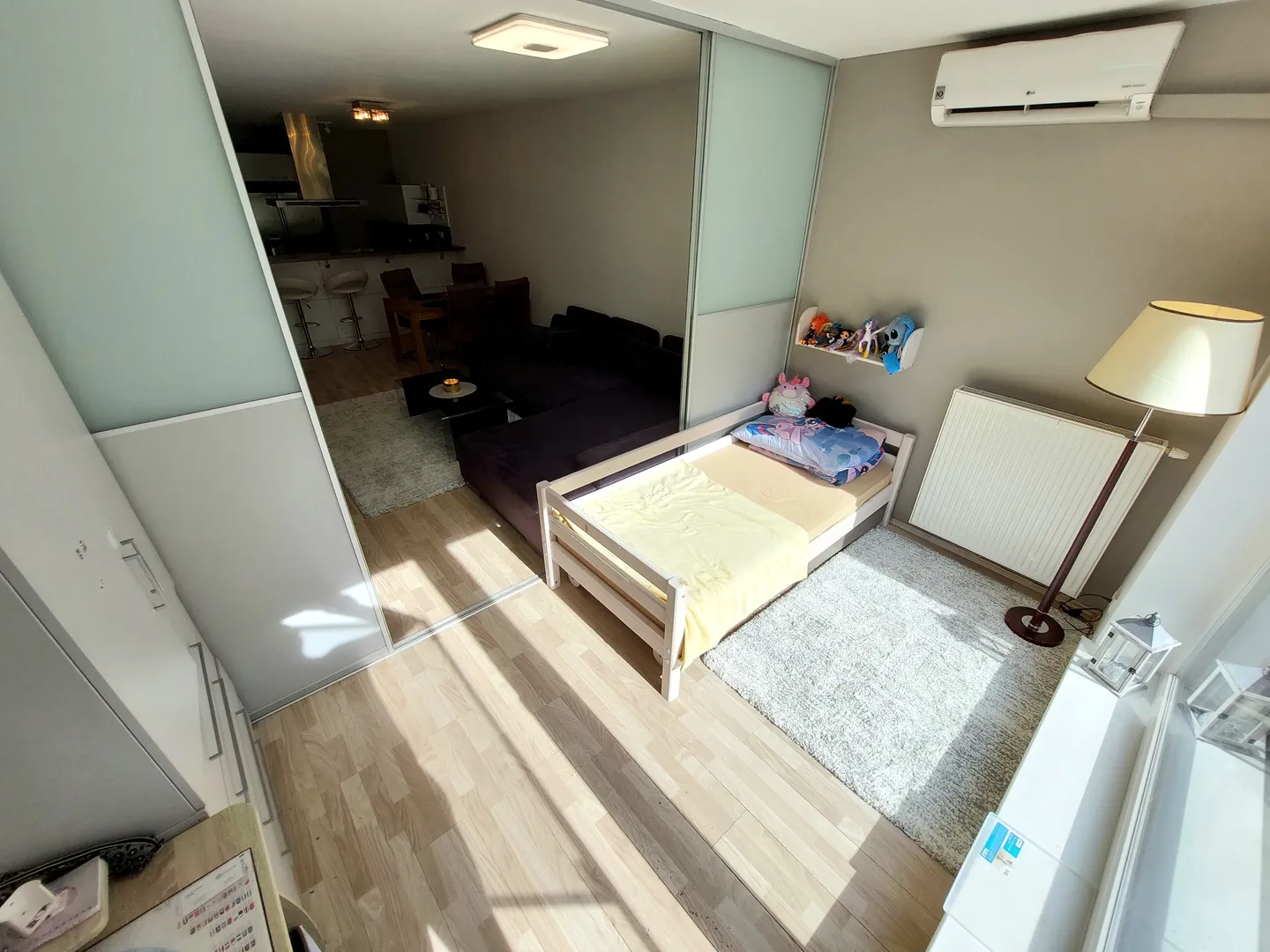 Dispozícia bytu pozostáva: vstupná chodba, kuchyňa prepojená s obývačkou, menšia izba ktorá je využívaná ako detská vznikla oddelením od obývačky posuvnou zástenou, spálňa s výstupom na terasu, priestranná kúpeľňa s vaňou, samostatné WC