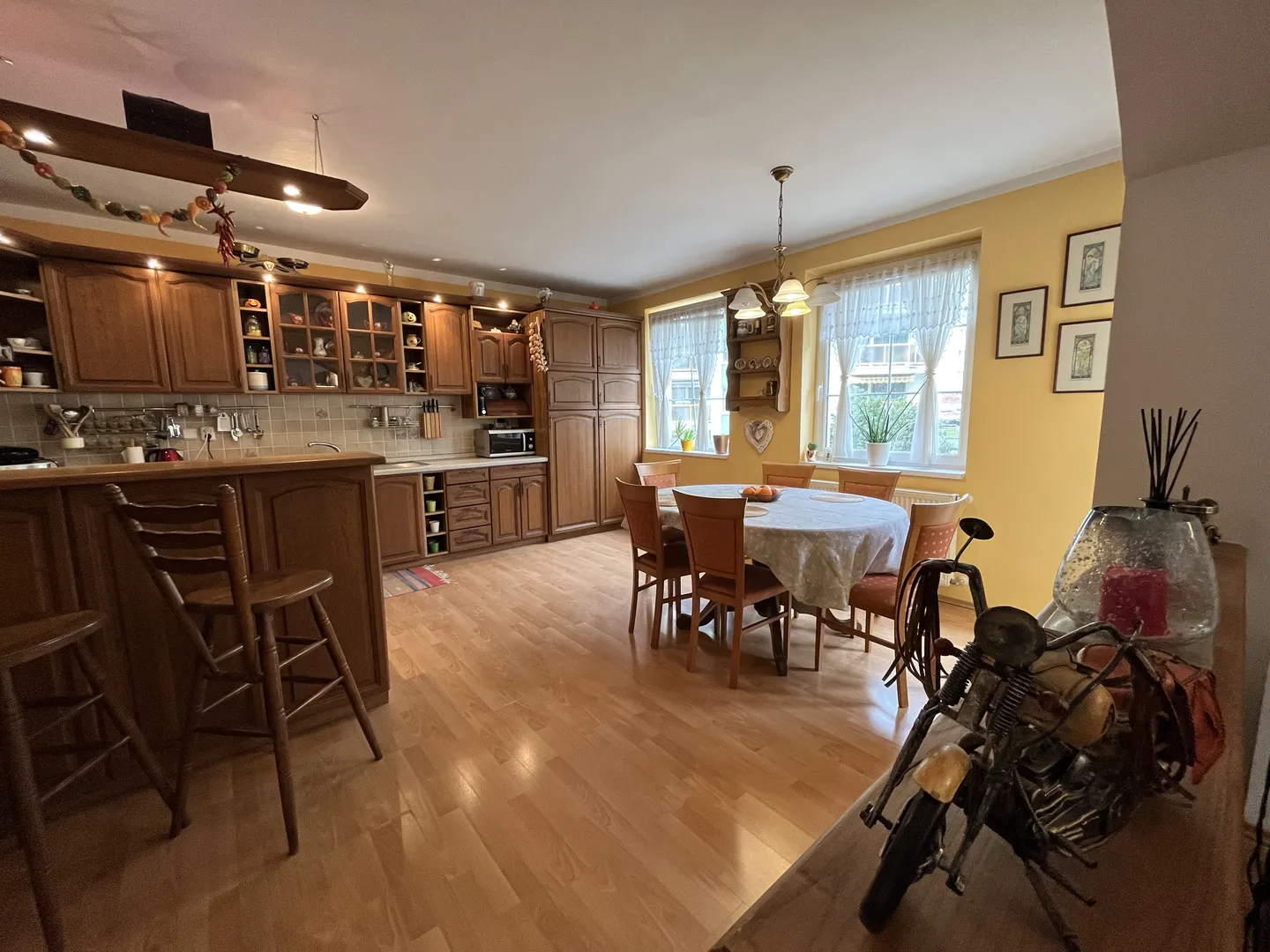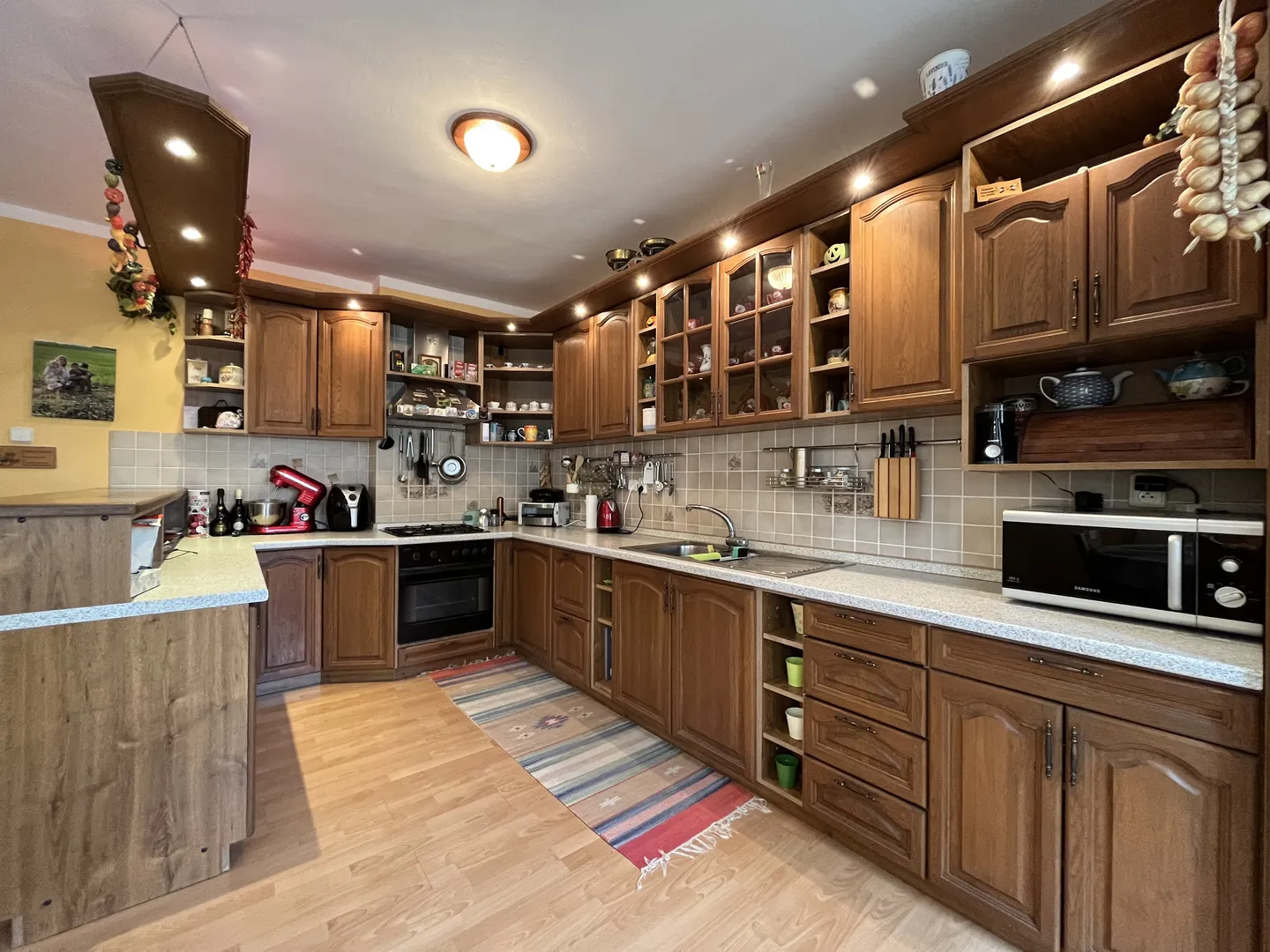 – veľká kuchyňa so zabudovanou kuchynskou linkou a s barovým pultom so stoličkami z dubového dreva, vstavanými spotrebičmi a s výstupom na balkón (6m2), elegantne prepojená s obývacou izbou.