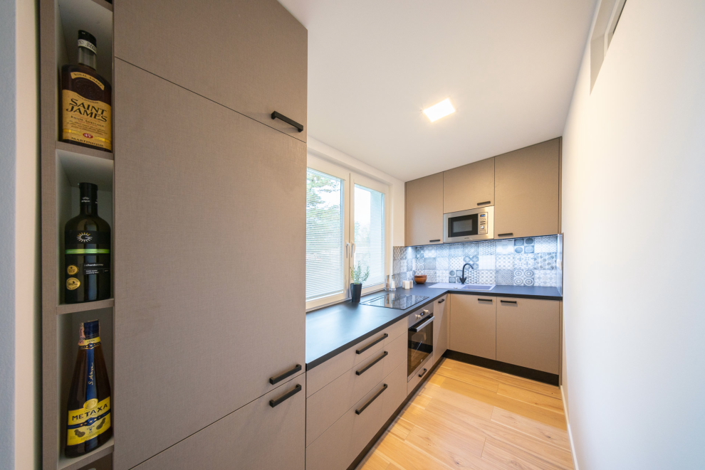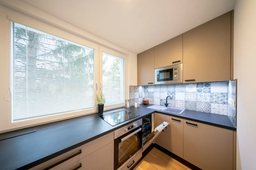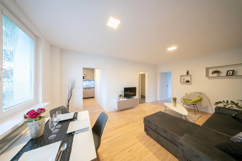 Súčasťou zariadenia a vybavenia bytu je nová sedacia súprava, jedálensky stôl a stoličky, nové zabudované elektrické spotrebiče s dvojročnou zárukou (chladnička, mraznička, mikrovlnná rúra, elektrická rúra a elektrickávarná doska).