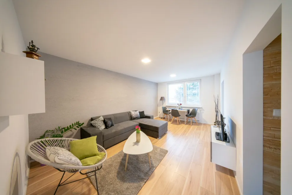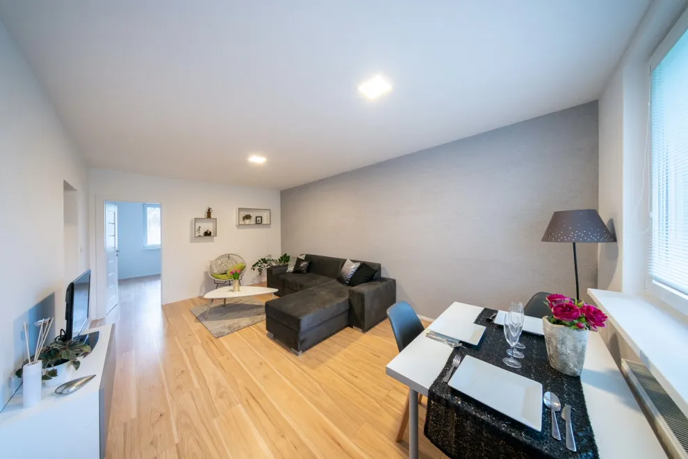 Byt prešiel tento rok kompletnou rekonštrukciou: elektro a vodoinštalácia, bezpečnostné protipožiarne dvere, plastové okná (izolačné 3sklo), nové interiérové dvere, sadrokartónové podhľady, všade LED svietidla, kvalitná dlažba a obklady, plávajúca laminátová podlaha hrúbky 8 mm, nová kuchynská linka na mieru so zabudovanými spotrebičmi, nová toaleta značky Geberit a wc misa rimfree, kúpeľňa s elektrickým podlahovým vykurovaním, sprchová sklenená zástena na mieru z kaleného skla ESG, LED sprchová hlavica, vypínače značky Legrand, nové omietky.